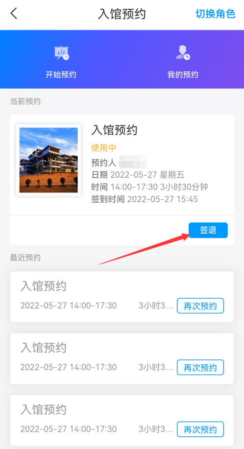 5.离开图书馆时,在出口处选择当前时段的预约条目的“签退”功能,扫码签退,成功后方可离开。