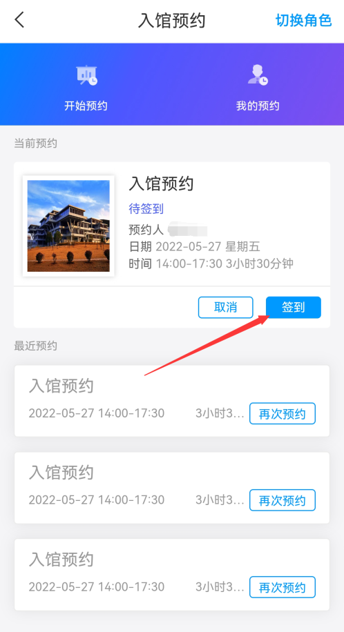 4.在图书馆入口处选择当前时段的预约条目的“签到”功能,扫码签到,成功后方可入馆;