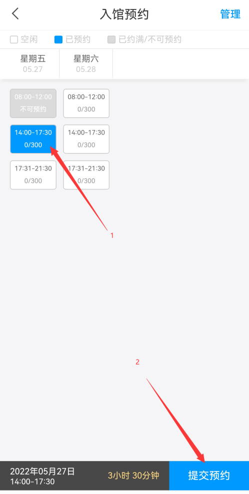 3.选择预约日期和时间段,提交预约,便可生成相应预约条目;