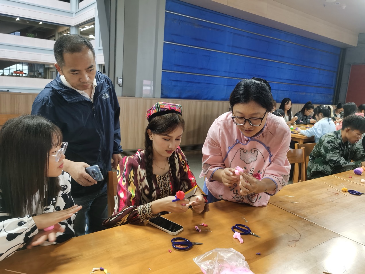 民俗文化体验现场人头传动,热闹非凡。徐州非遗文化传承人张敏面向师生,现场教学制作香包和捏面人民俗技艺。张敏老师向热情高涨的师生简介了香包、捏面人的来历和传承,详细讲解如何一步一步缝制香包和制作中的关键步骤与技巧并演示,展示了一团团彩泥如何经过“揉、搓、捏”,再用小竹刀灵巧地把每个面泥塑造成自己想要的形状,最后把所有的材料拼接起来,逐渐形成惟妙惟肖的一个作品。在现场张敏老师还对一些师生进行个别操作师范、指导,师生们也是纷纷上阵,不停的尝试问询,大家也是相互帮助,其乐融融。渐渐地每个人每个人手中都有了自己的成型的作品,兴高采烈而归。